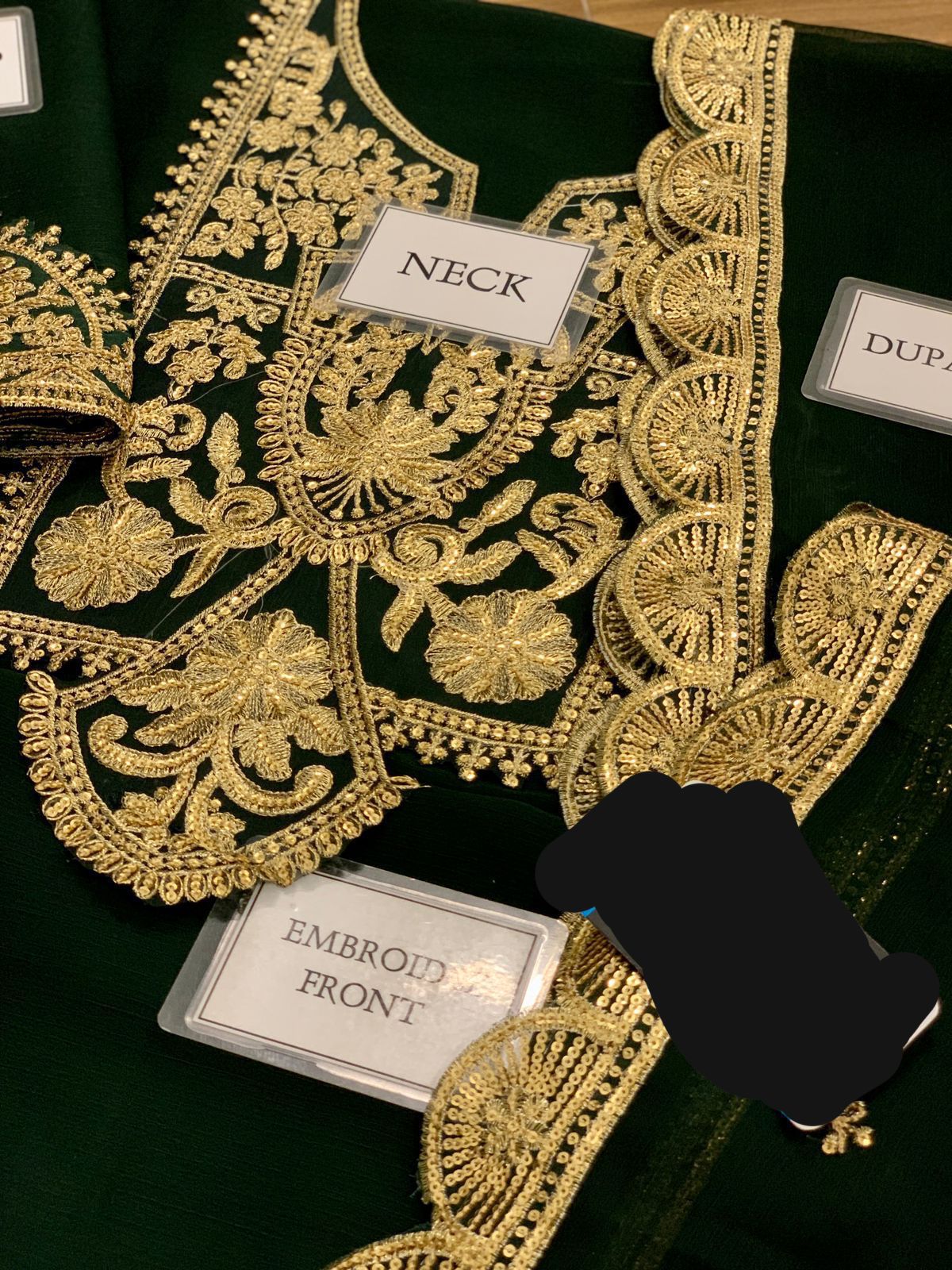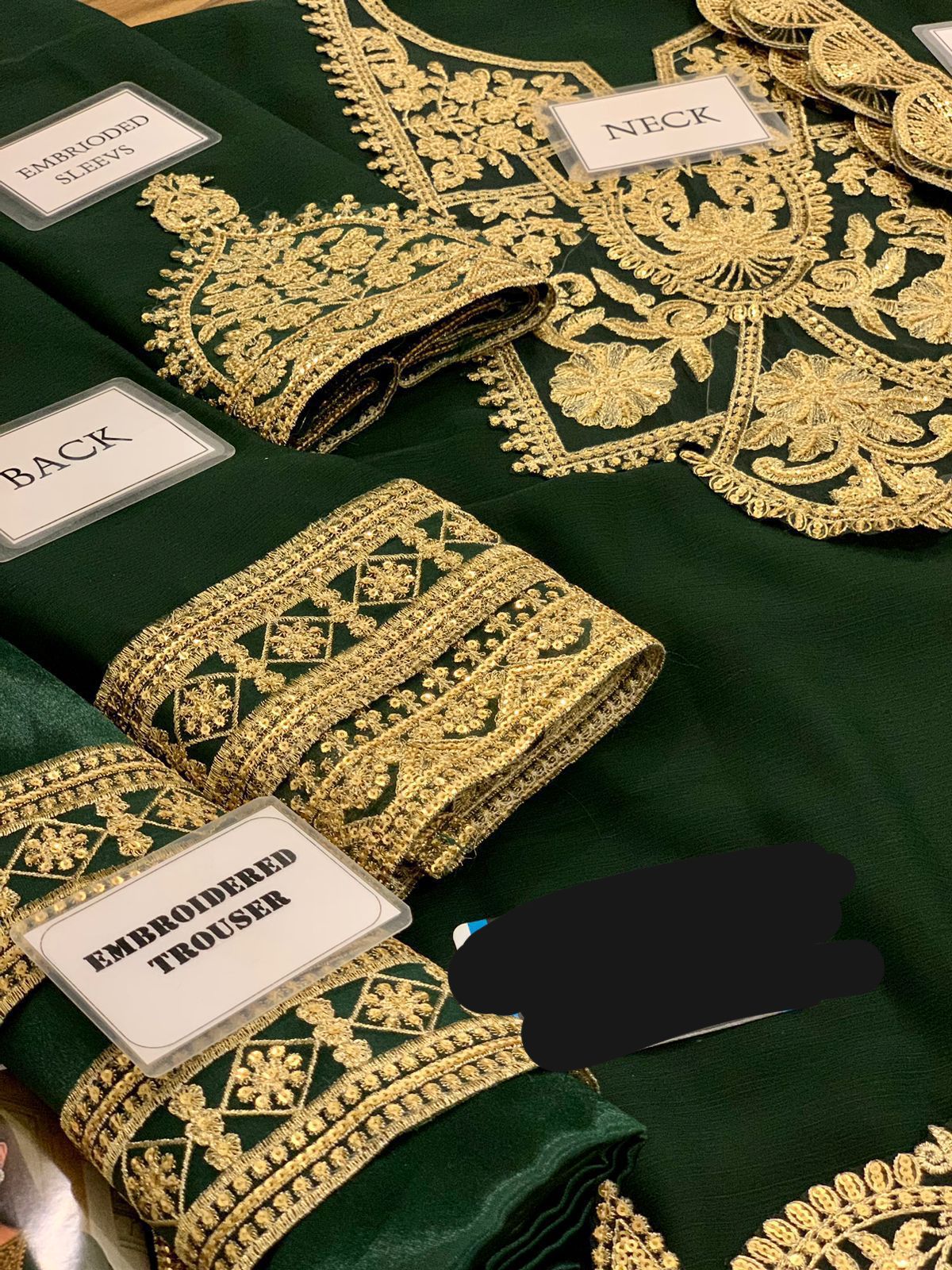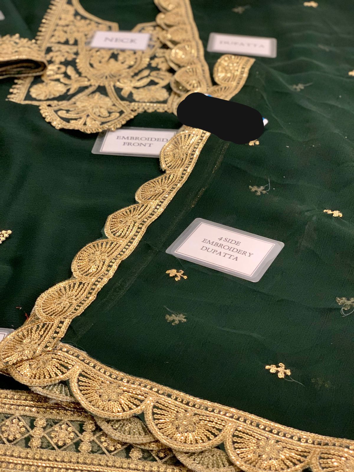 chiffon fully heavy embroidered spengle work spengle work neck with heavy embroidered spengle work left & right bunches with heavy embroidered spengle work 2type daman boarder with embroidered spengle work chak lace