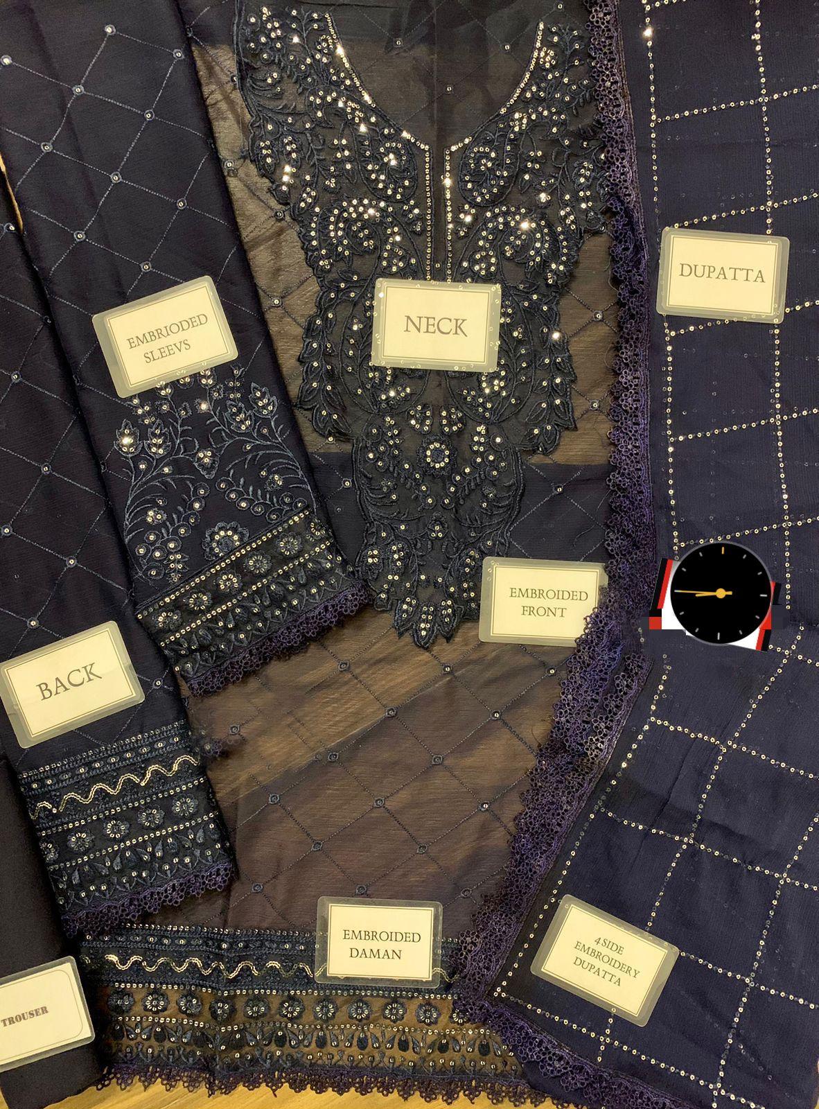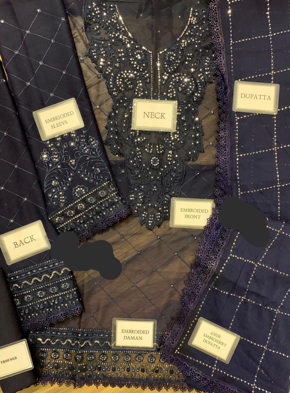 chiffon fully heavy embroidered spengle work front with heavy embroidered spengle work neckline with heavy embroidered spengle work daman boarder with schifflie lace attach