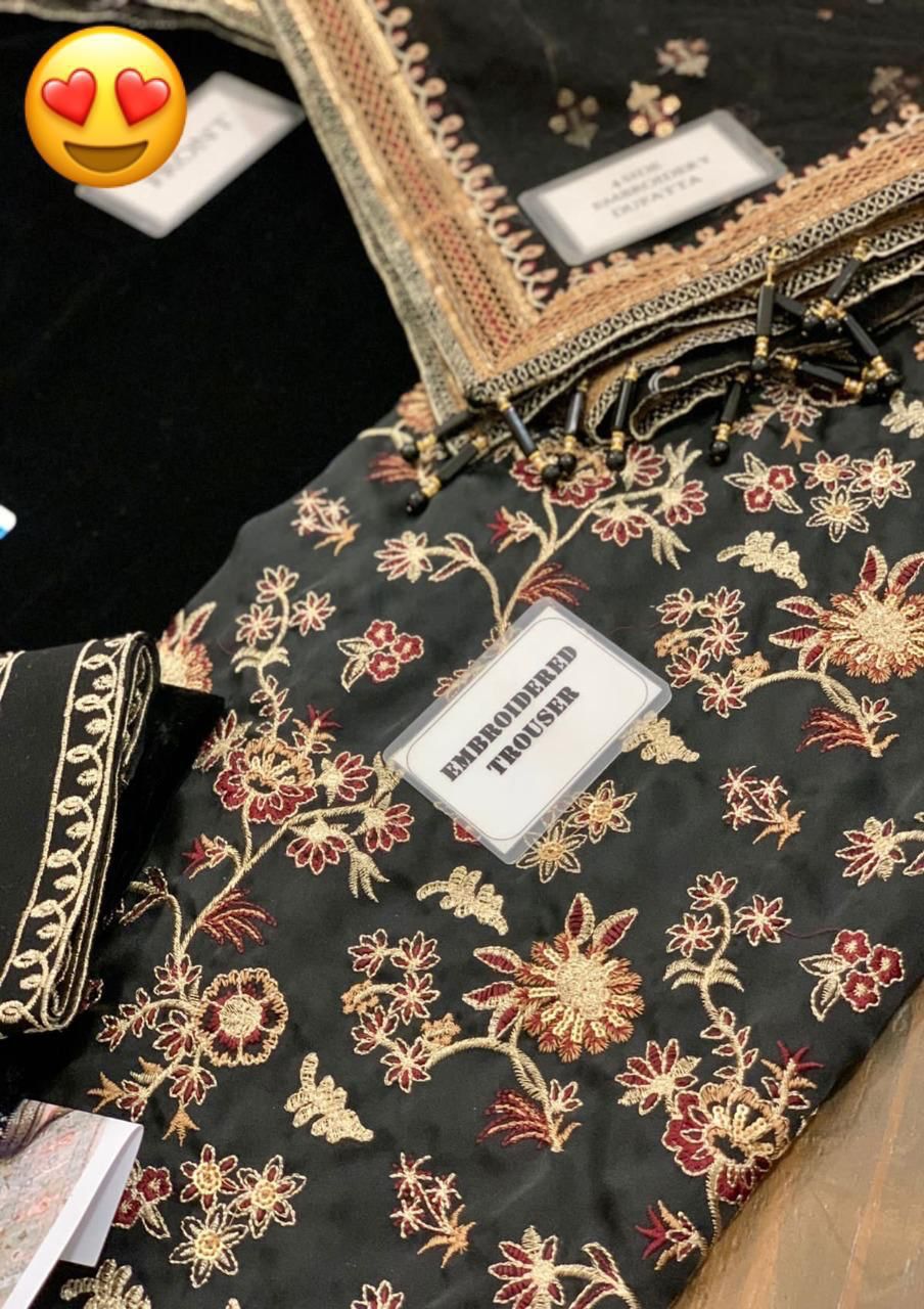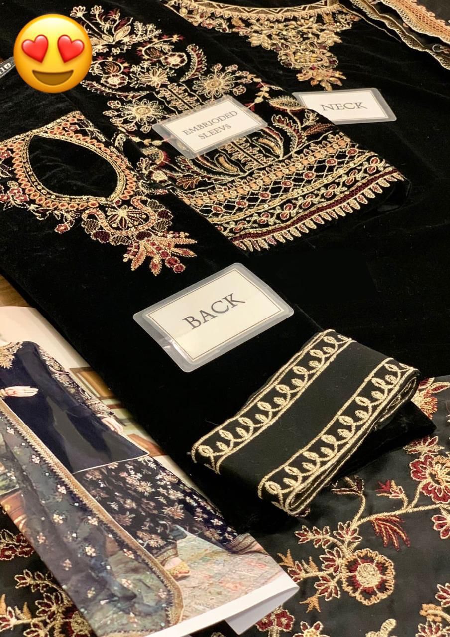 Limited Stock Available*Baroque Jazmin Velvet Wedding Collection-BLACK Fabric Details • Shirt: Velvet Micro • Duppata: Organza • Trouser: Dull Silk Details: • Heavy Embroidered Front • Embroidered Daman Border • Embroidered Sleeves. (fabric for full fall in sleeves without any joint) • Full Embroidered Trouser • Embriodered Back Border • Cutwork Embroidered Heavy Duppata With 4 Sided Borders video on demand