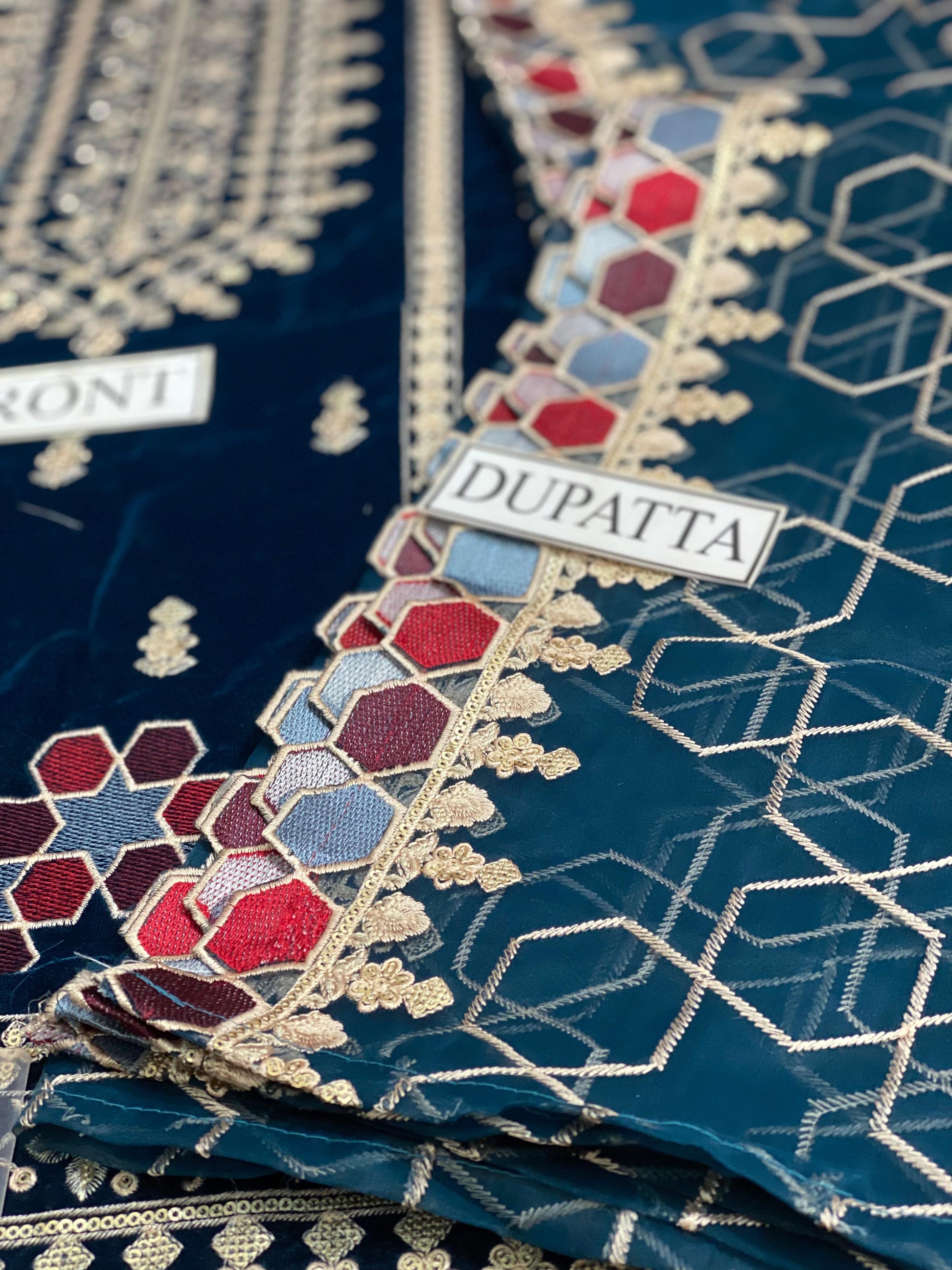 Velvet embroided alternate front with embroided border on velvet