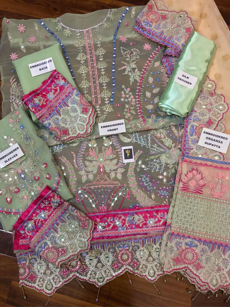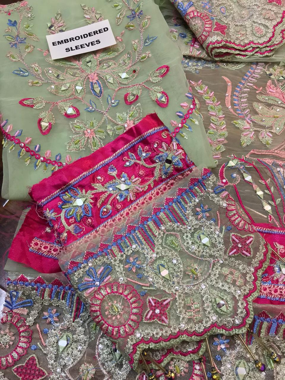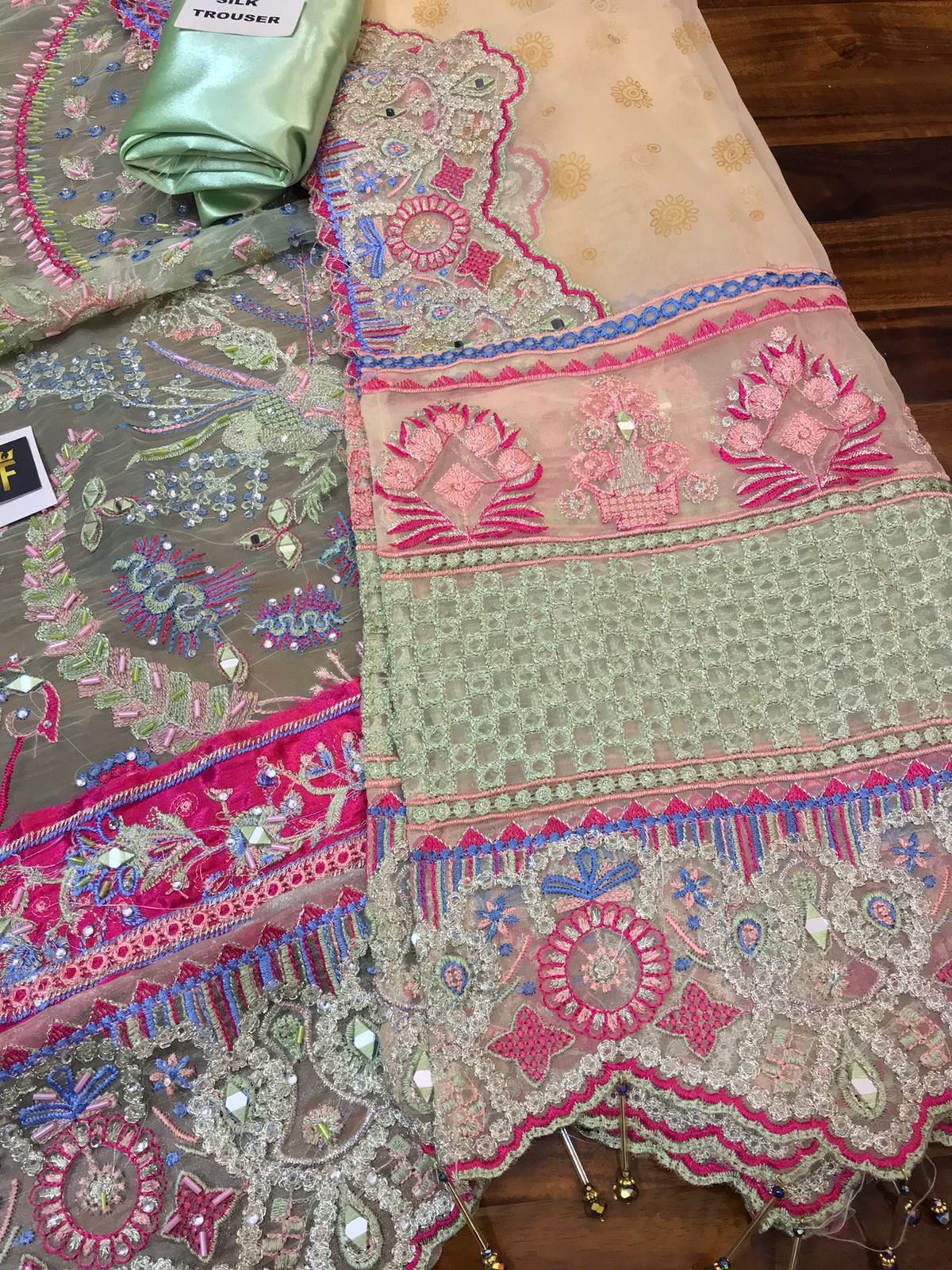 * ORGANZA HEAVY EMBROIDERED FRONT EMBELISH WITH HANDWORK AND STITCH MIRROR WORK ALONG WITH EMBROIDERED BORDER PATCH (2 PCS)