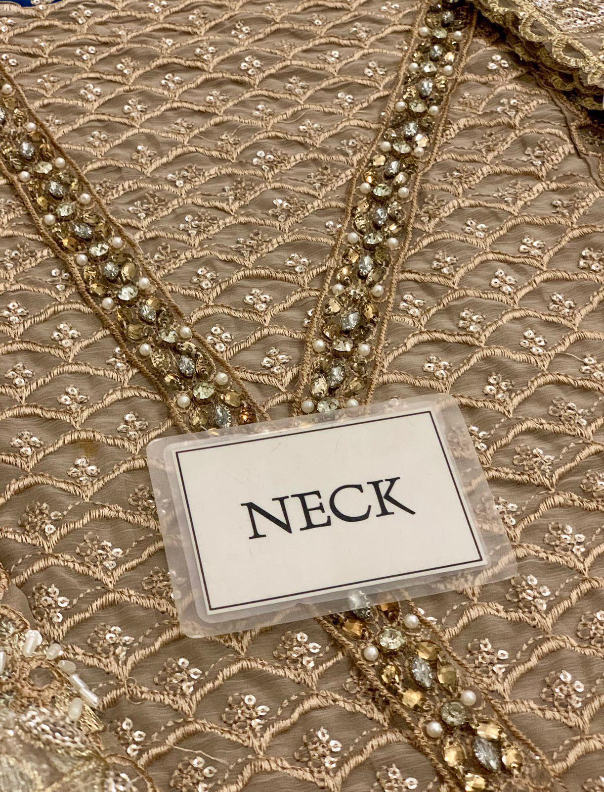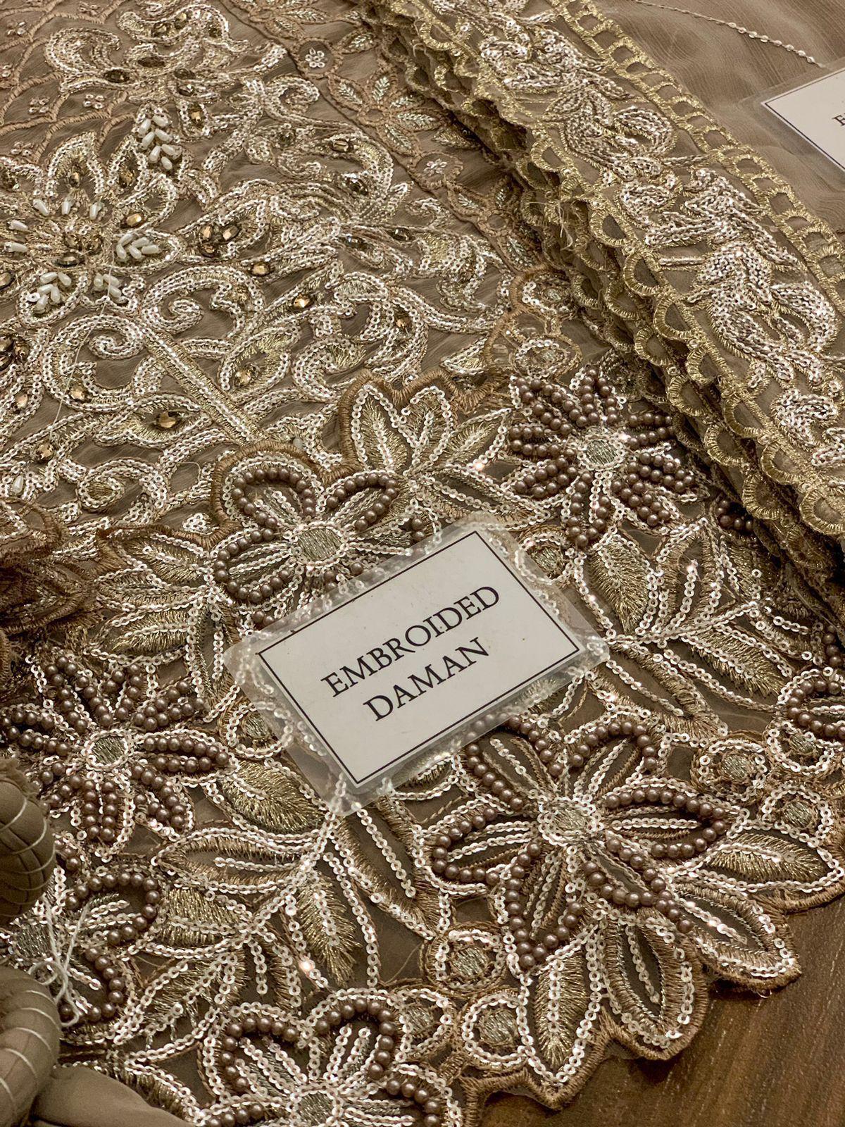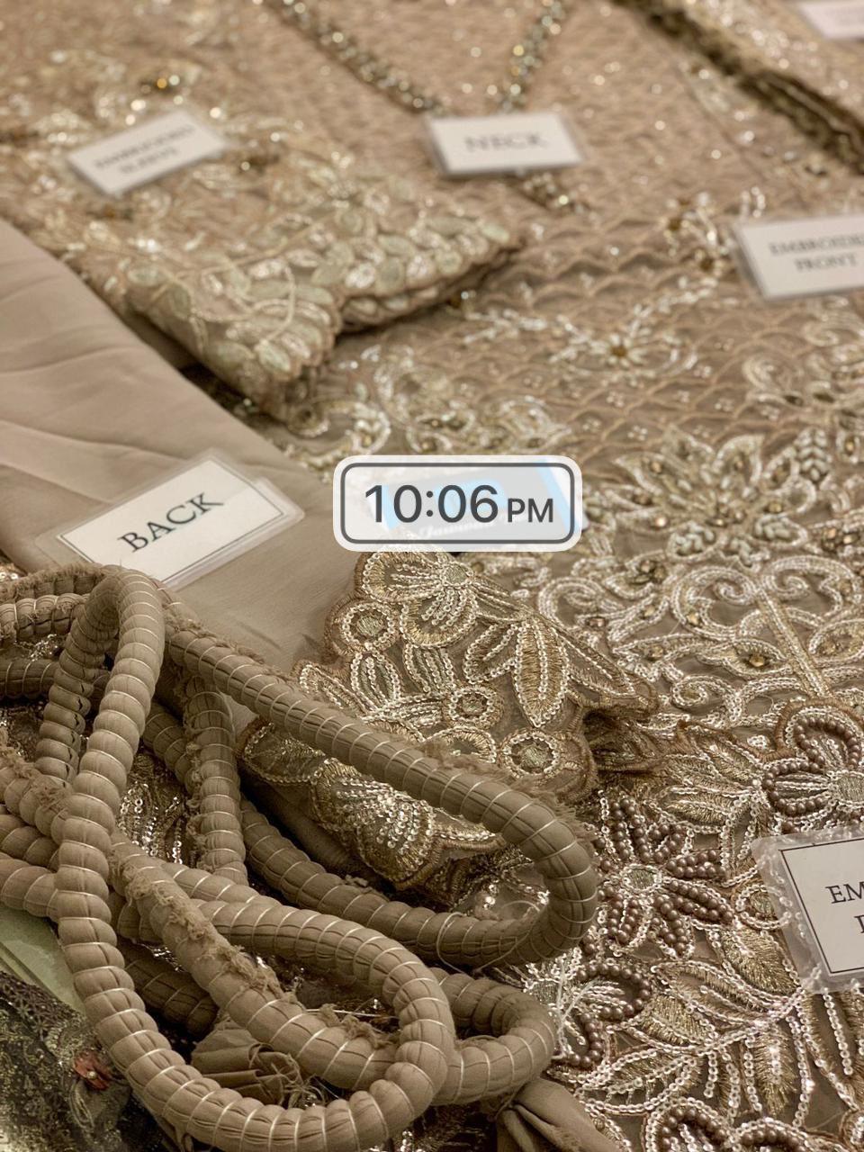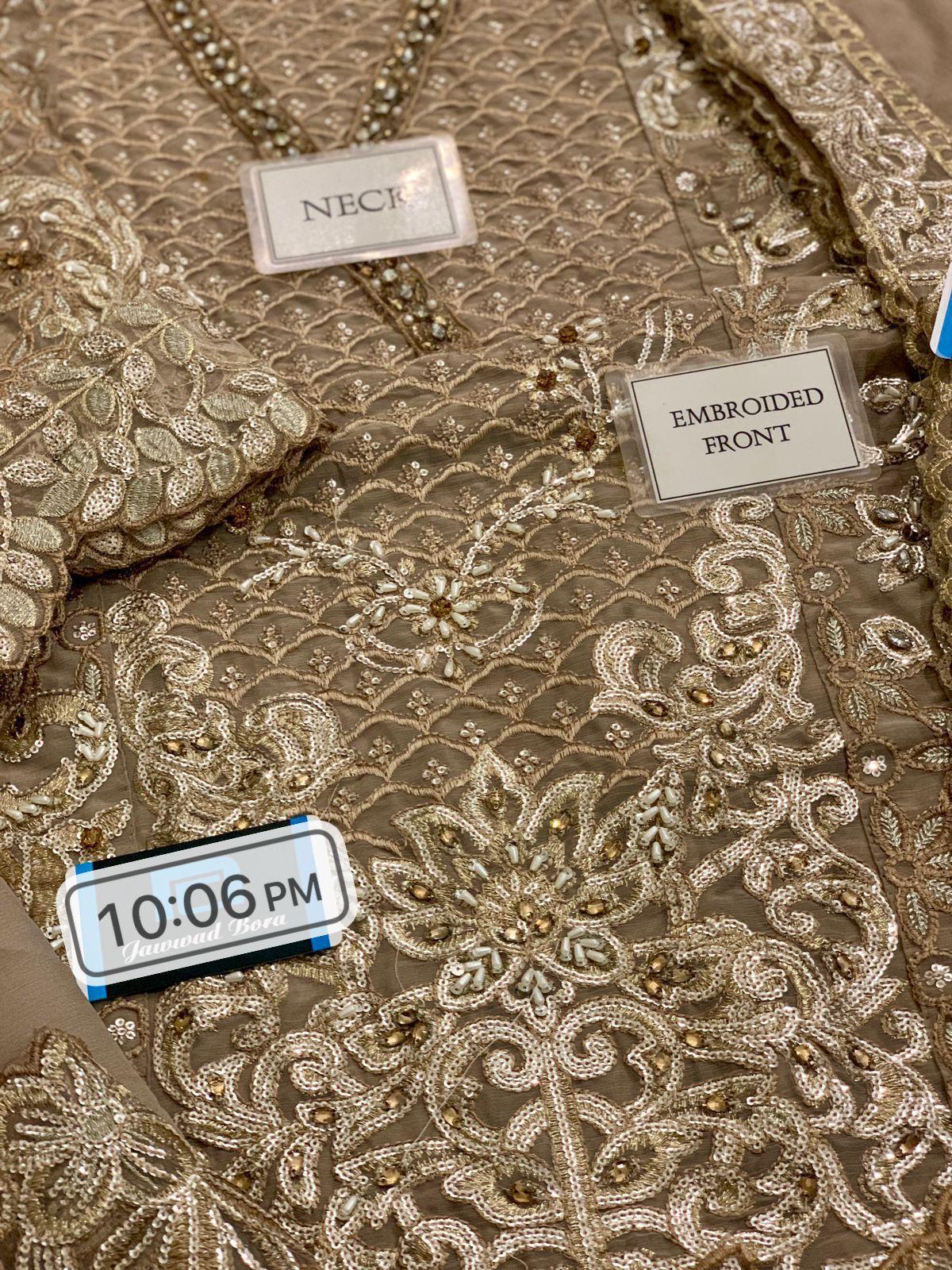 chiffon fully heavy embroidered spengle work centre panel with fully heavy hand emblishment adda work centre panel with fully heavy embroidered spengle work left & right panel attach with fully hand emblishment adda work with heavy embroidered spengle work daman boarder with heavy hand emblishment adda work  neckline lace  fully emblishment adda work